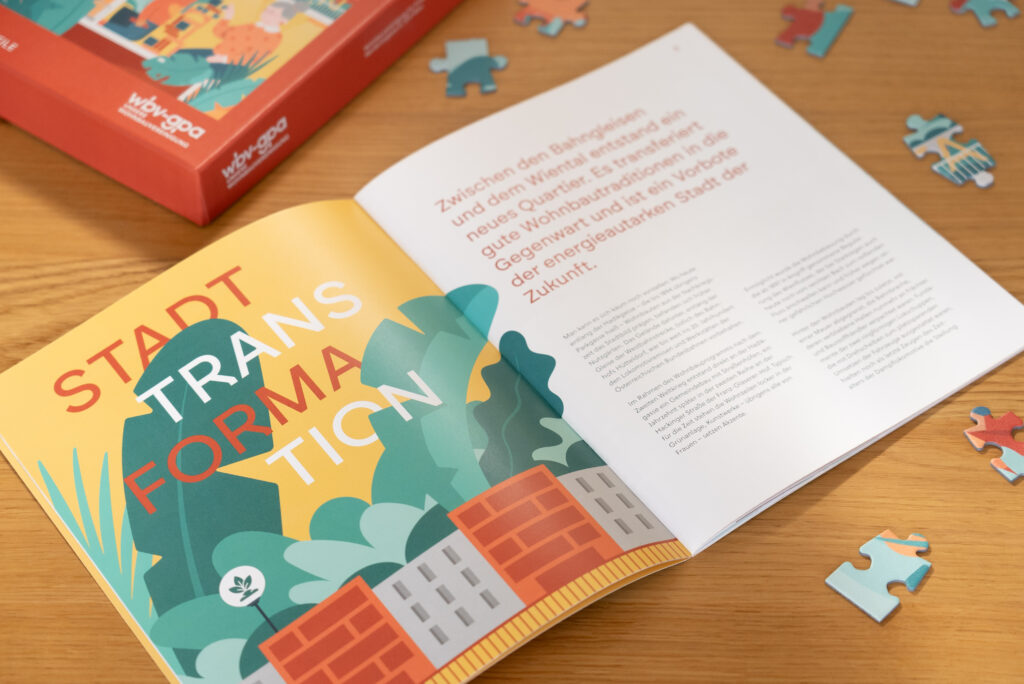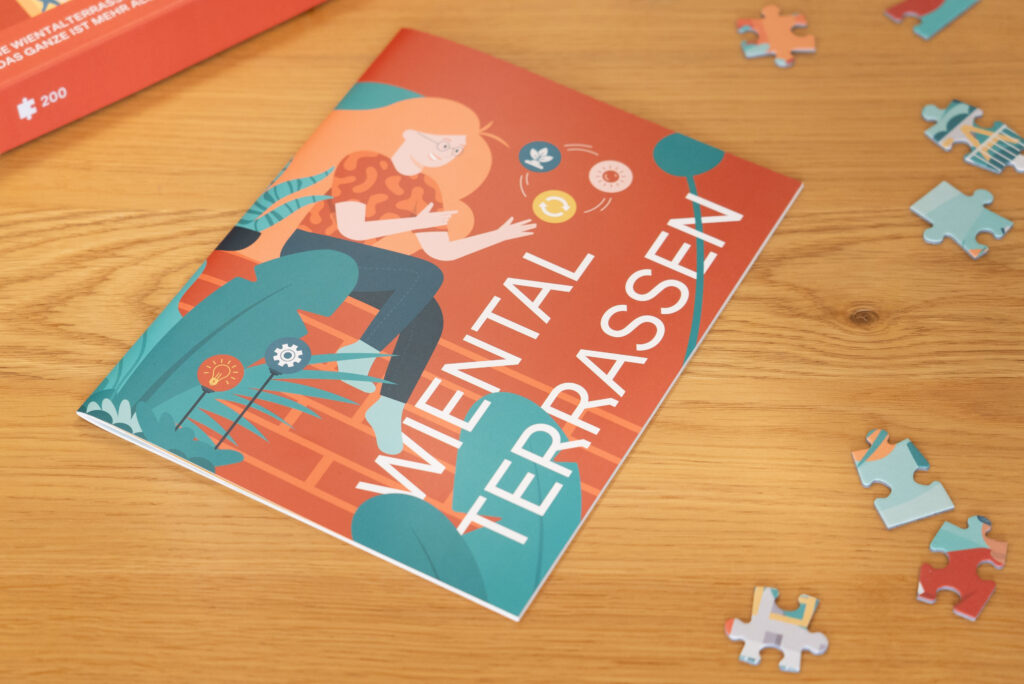 Die vielen unterschiedlichen Aspekte des Projekts übersetzte das Team von Schrägstrich in eine Puzzle-Metapher, die im wahrsten Sinn des Wortes zum Leben erweckt wurde: ein 200‑teiliges Puzzle mit einer aufwändigen Illustration, die alle Aspekte des Projekts darstellt. Ergänzend entstand eine Broschüre, die das Projekt im Detail vorstellt. Das Set wurde als hochwertiges Geschenk für Stakeholder eingesetzt und macht die Innovationsvielfalt der Wientalterrassen greifbar.
